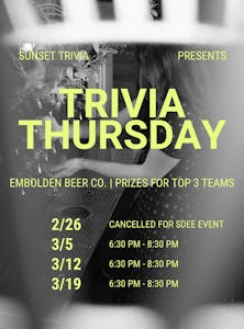 Hosted by Sunset Trivia, this is your chance to show off your smarts and enjoy a night out with friends.