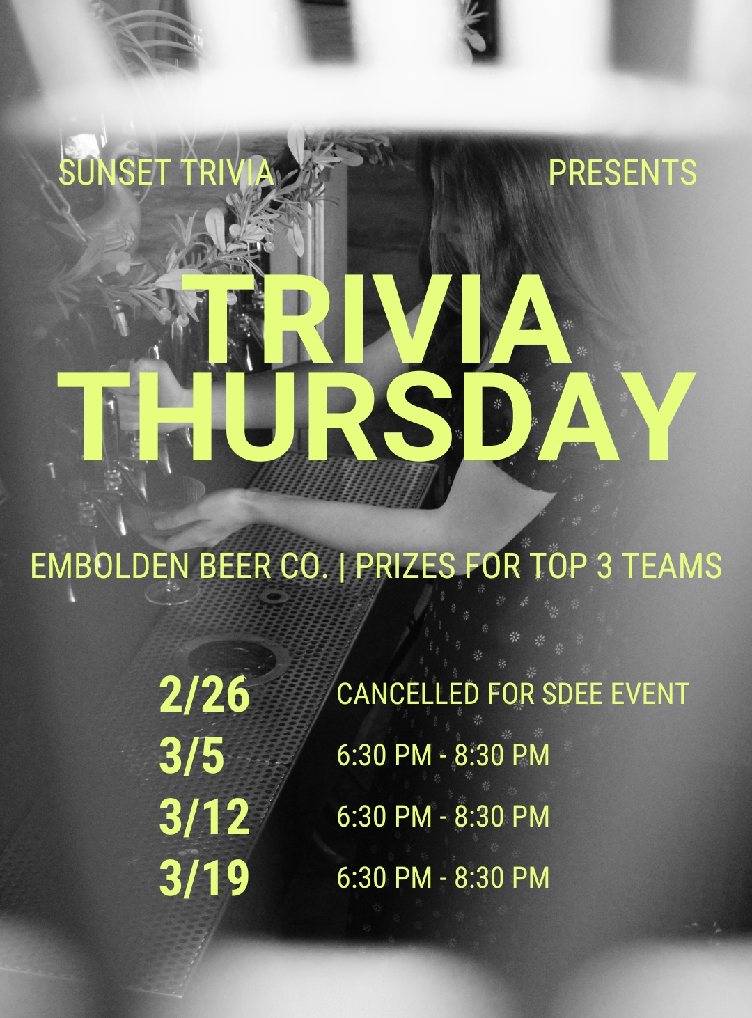 Hosted by Sunset Trivia, this is your chance to show off your smarts and enjoy a night out with friends.